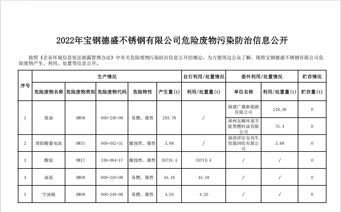 2022年寶鋼德盛不銹鋼有限公司危險廢物污染防治信息公開